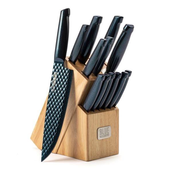 Tackle prep work in the kitchen with cutlery that is a cut above. Diamond Texture Technology - diamond texture creates air pockets to prevent food from sticking. Crafted from CR13 stainless steel that is lightweight and incredibly durable. Precision cut edge and nonstick coating delivers clean slices. Ergonomic handle with slip-resistant finish. Dishwasher safe. Includes: 8" Chef knife. 7.5" Bread knife. 7" Santoku knife. 6" Utility knife. 5" Serrated Utility knife. 3.5" Paring knife. 8" Sharpening steel. 6 Steak knives. Wood knife block.