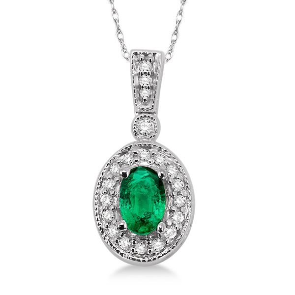 Everyone will ask how long they've been in the family. Timeless beauty. This vibrant milgrain-finished emerald and diamond pendant necklace is the perfect complement to complete your look. Fashioned in glowing 14k white gold, this dazzling necklace showcases a centrally staged 6x4mm oval emerald that's accentuated with .15twt round-cut diamonds set to glowing perfection. Suspended from an 18" cable chain with a lobster claw clasp.